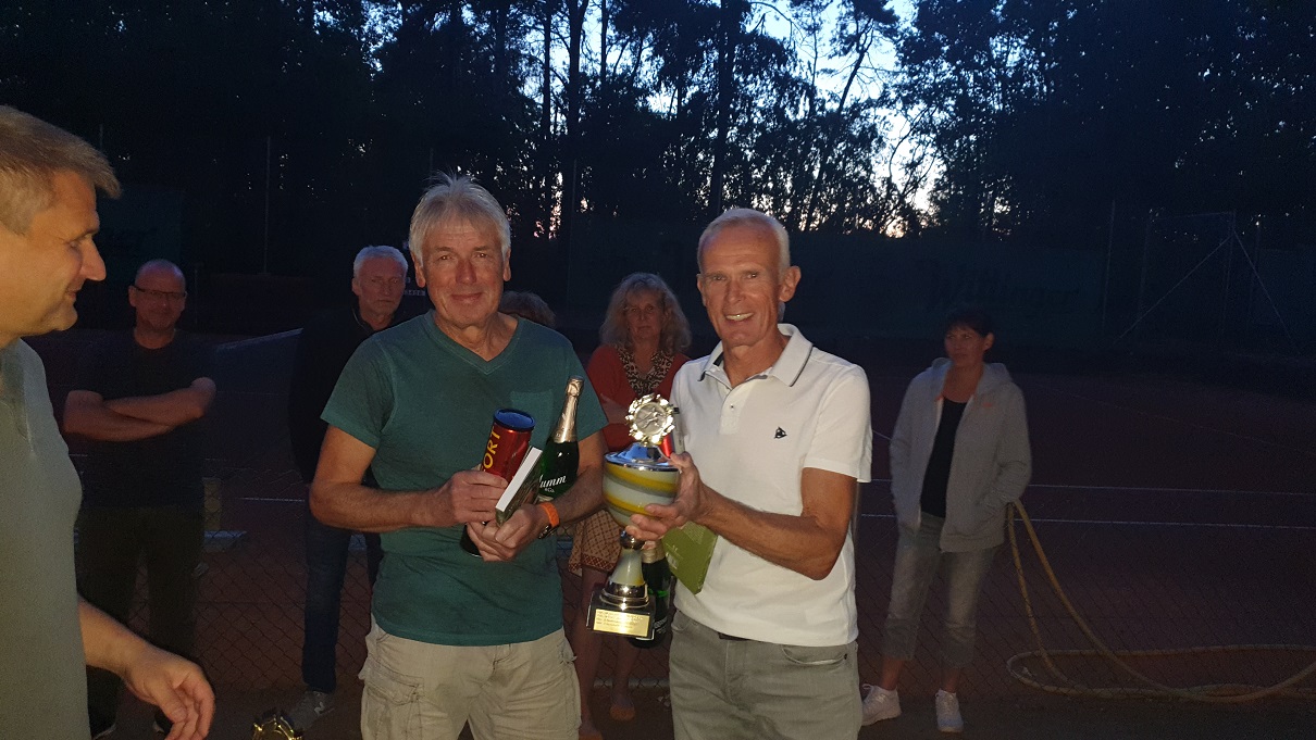 Am Freitag und Samstag fanden in Hankensbüttel auf der Anlage im Finkenweg die Halbfinal- und Finalspiele des diesjährigen Isecups statt. In der Konkurrenz Herrenoffen kam es zu folgenden Halbfinalspielen : Lars Wasserscheidt/Christian Holthaus als Gruppensieger der Gruppe A gegen Björn Meyer/ Dirk Dankert als Gruppenzweiter Gruppe B. Es entwickelte sich eine einseitige Partie, die Wasserscheidt/Holthaus klar mit 6:2, 6:0 für sich entschieden. Im zweiten Halbfinale gewannen Christian Meyer/Jens Bernhard,(VfL Knesebeck) zuvor Gruppenzweiter in Gruppe A gegen Matthias Geng/Carsten Voges ( Gruppensieger B) mit 6.4,6:2. Damit kam es am Samstag im Finale zur Neuauflage des Gruppenspiels Wasserscheidt/Holthaus gegen Meyer,Christian/Bernhardt Jens. Siehe IK vom Freitag 02.09.). → Zu den Ergebnissen Und wieder wurde es ein spannendes, enges Match, das die vielen Zuschauer bei traumhaftem Tenniswetter über fast 3 h am Samstagnachmittag begeisterte. Nachdem Lars Wasserscheidt/Christian Holthaus Den 1. Satz mit 6: 4 gewonnen hatten, und im zweiten Satz 4:3 führten, wendete sich das Blatt. Meyer/Bernhard machten 8 Spiele in Folge, gewannen damit den 2. Satz 6:4, und führten 5:0 im Entscheidungssatz. Alles schien entschieden, doch Wasserscheidt/Holthaus überwanden ihre Schwächephase und konnten nochmal auf 5:5 ausgleichen. Dann jedoch machten Meyer/Bernhardt den Sack endgültig zu, und gewannen 7:5. ![]() Bei den Damen ging es nicht ganz so spannend, aber trotzdem hochklassig zu, alle Finalspiele wurden in 2 Sätzen entschieden. In den Halbfinalspielen setzten sich Wally Nikolai/Monika Klasen (TC GW Hankensbüttel) gegen Anika Marwedel und Luisa Behnke (TSV Schönewörde) mit 6:0, 6:3 durch. Sonja Jansen/ Antje Meyer( VfL Wahrenholz) gewannen gegen Meike Lütkemann/ Kornelia Meyer(Hankensbüttel/WahrenholZ) mit 6:3,6:2. Damit kam es auch in dieser Konkurrenz zur Wiederholung eines Vorrundenspiels aus Gruppe A. Hier bestätigte sich allerdings das Vorrundenergebnis. Mit einer sehr starken Leistung gewannen Nikolai/Klasen den 1. Satz mit 6:1, ehe ihre Gegnerinnen beim Stand von 1:1 Verletzungsbedingt aufgaben. ![]() In der Herren 120 Konkurrenz hatten sich am Freitag Nachmittag Wolgang Bührke und Heinrich Schneck(Hankensbüttel) mit 6:4, 6:1 gegen Roland Klingner und Ulrich Gerlof (Wahrenholz) für das Finale qualifiziert, in dem sie auf Reinhard Gruber und Hans-Jürgen Holthaus trafen, die sich gegen Oliver Meyer und Helmut Mollenhauer durchsetzten.(4:6,6:2,10:8). Auch dieses Finale zog die Zuschauer wieder in ihren Bann. Bührke/Schneck gewannen 6:4,4:6,6:4 gegen Gruber/Hans-Jürgen Holthaus. O-Ton Heinrich Schneck: „ausgeglichenes Spiel mit immer wieder erfolgten Breaks.., daher spannend, was den Ausgang betraf, im 3. Satz schon 5:1 Führung, dann kamen J und R auf 5 zu 4 ran… aber es reichte nicht mehr zum Ausgleich.“ ![]() |